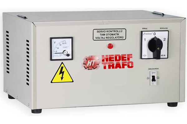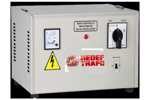 Servo-Kontrol gerilim düzengeci, düzenlemeyi sağlayan troidal transformatör (variak), yardımcı transformatör ile değişken transformatöre kumanda eden servomotora çıkış gerilimine göre kumanda veren elektronik devrelerden oluşmuştur. Hızlı cevap verme zamanını içeren kontrol sistemi ile, yüksek baslangıç tork'lu DC motor dizgesi girişteki küçük gerilim değişimlerini bile hızla düzeltir. Servo-motor giriş gerilimi çalışma sınırları dşına çıktığında limitswitchler tarafından, çıkış gerilimi otomatik olarak istenen değere ayarlandığından kontrol devresi tarafından devreden çıkarılır. Regülasyon tamamlandığında elektronik frenleme devresi yardımıyla motorun enerjisi kesilir ve sessiz çalışır. Çalışma Voltaj Aralığı Standart Modellerde - 150 / 250 giriş 220 V çıkış Özel Siparişlerde -120 / 230 V giriş 220 V çıkış Istenilen voltajlarda özel imalat yapılır
